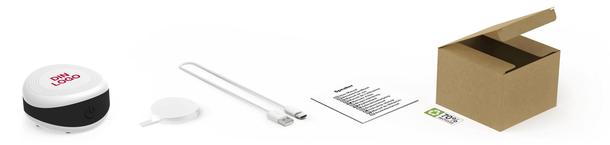 Bluetooth® navnet er hva brukeren ser på smarttelefonen eller nettbrettet når det kobles til audio produktet. Vi kan tilpasse dette til ditt firmanavn og gi organisasjonen ytterligere eksponering. Hvis du ikke vil ha denne tjenesten kommer "Promo Audio" til å være standardnavnet på produktet.Mål og vekt