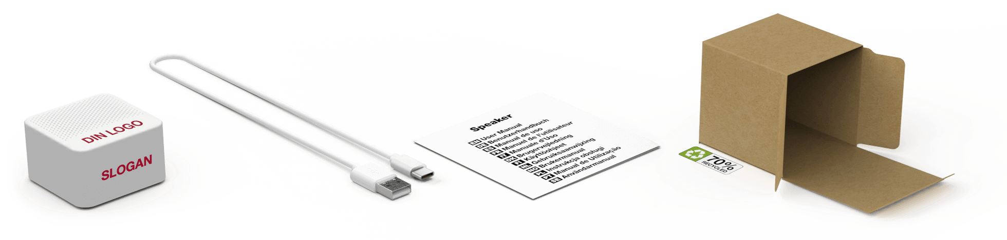 Bluetooth® navnet er hva brukeren ser på smarttelefonen eller nettbrettet når det kobles til audio produktet. Vi kan tilpasse dette til ditt firmanavn og gi organisasjonen ytterligere eksponering. Hvis du ikke vil ha denne tjenesten kommer "Promo Audio" til å være standardnavnet på produktet.Tilbehør