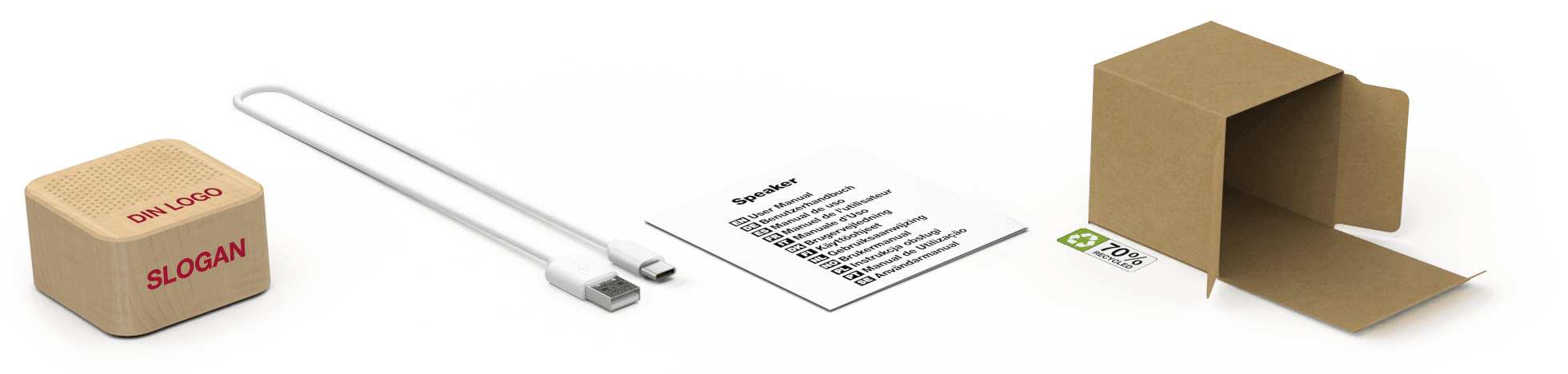 Denne vakre Bluetooth®-høyttaleren er laget av naturlig lønnetre og er mer miljøvennlig enn alternativer i plast. Den er kompatibel med alle de største telefon- og nettbrettmerkene med Bluetooth®-tilkobling. Så uansett hvilken enhet mottakerne dine bruker, kan de nyte favorittlåtene sine uansett hvor de er. Vi tilbyr også et stort utvalg av høyttalertilbehør, inkludert karabinklips for enkel reise og en magnetboks for smartere presentasjon.
