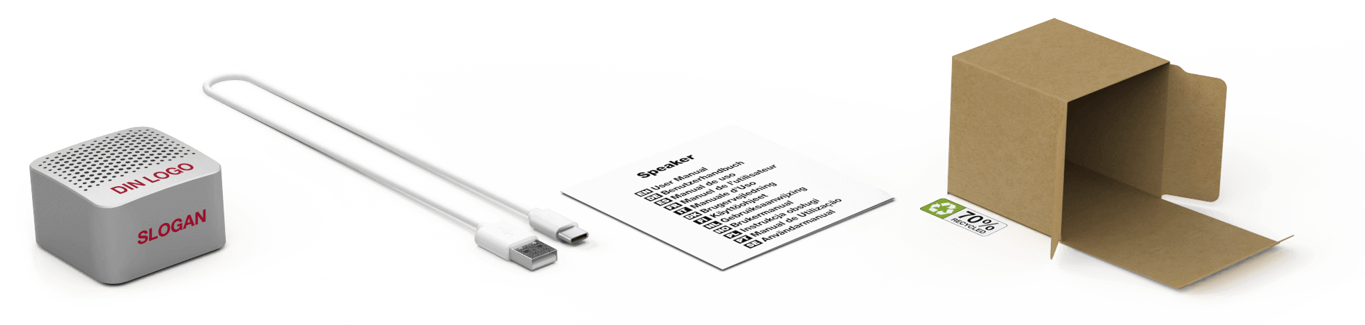 Bluetooth® navnet er hva brukeren ser på smarttelefonen eller nettbrettet når det kobles til audio produktet. Vi kan tilpasse dette til ditt firmanavn og gi organisasjonen ytterligere eksponering. Hvis du ikke vil ha denne tjenesten kommer "Promo Audio" til å være standardnavnet på produktet.Tilbehør