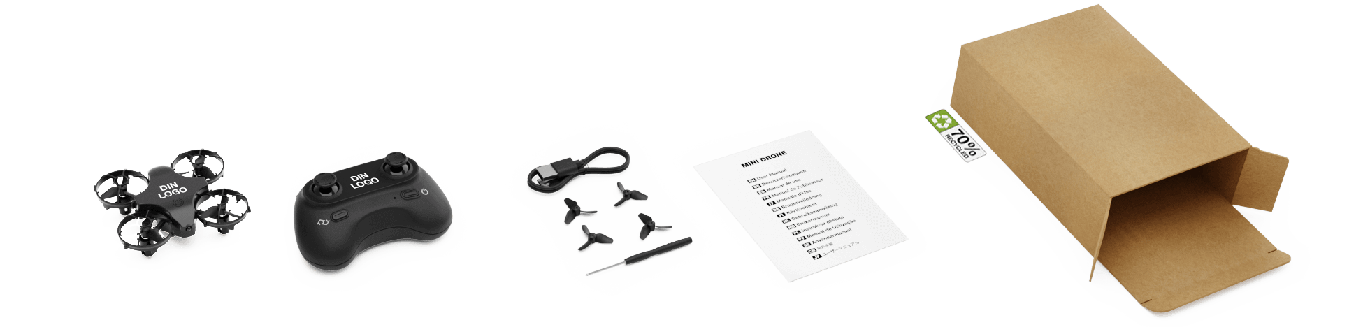 Den har en enkel start- og landingsfunksjon med ett trykk, mens propellbeskyttelsen øker sikkerheten og beskytter minipropellene. Den automatiske funksjonen for å unngå hindringer gjør det morsomt og trygt for mottakerne å leke med den hodeløse modusen og 360-graders vippefunksjonen, eller som en demonstrasjon på messestanden din. Merk: Denne minidronen har ikke kamera.