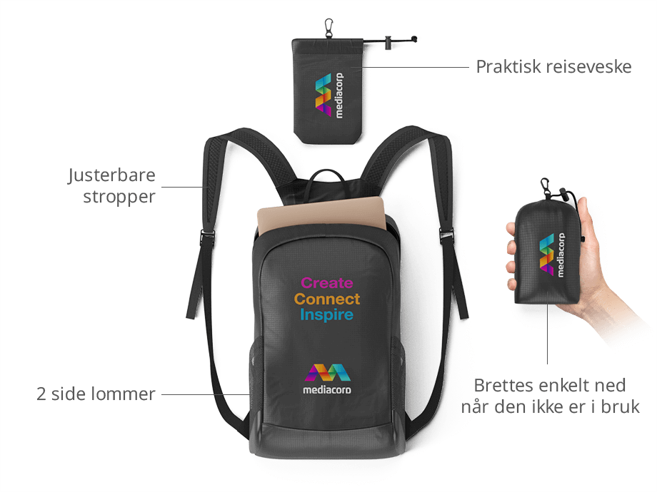 Denne lette ryggsekken er laget av slitesterk polyester og har en praktisk sammenleggbar design som gjør at den enkelt kan pakkes ned i sin egen stappesekk når den ikke er i bruk. Dette gjør den til et ideelt reisefølge for kundene og medarbeiderne dine, enten de pendler til jobben eller er ute på helgetur.