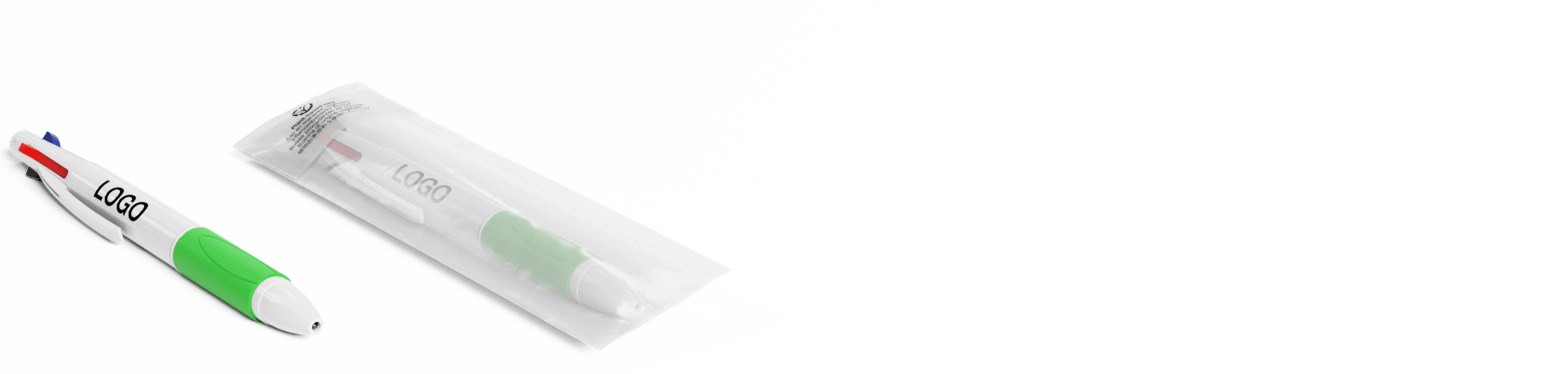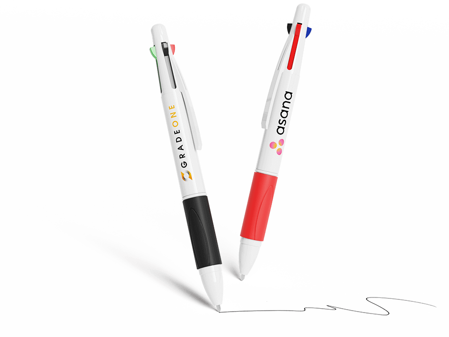 Quad er en klassisk 4-farget penn som kan skilte med blå, røde, grønne og svarte kulepenner i den ene modellen. Hvert fargealternativ vises og skjules via trykkskyveknappene øverst på pennen. Det komfortable gummigrepet i termoplast er tilgjengelig i en rekke farger for å komplementere din merkevarestil. Det utvendige hvite skallet kan fototrykkes med din logo, slagord og mer.