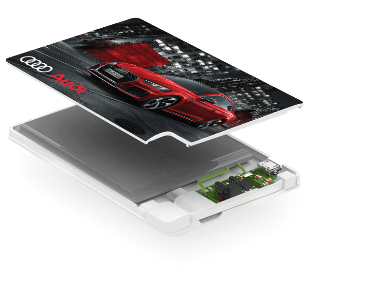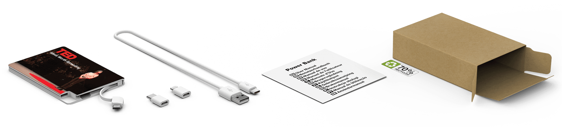 The Card er en liten powerbank med en minneverdig effekt. Det er den perfekte messegaven eller gaven til de ansatte for å sikre at telefonbatteriet holder seg fulladet og klart til viktige telefonsamtaler og møter. Med en mikro-USB-kabel med både lightning- og USB-C-adaptere er enheten kompatibel med alle de største merkene av mobile enheter, fra telefoner til nettbrett.
